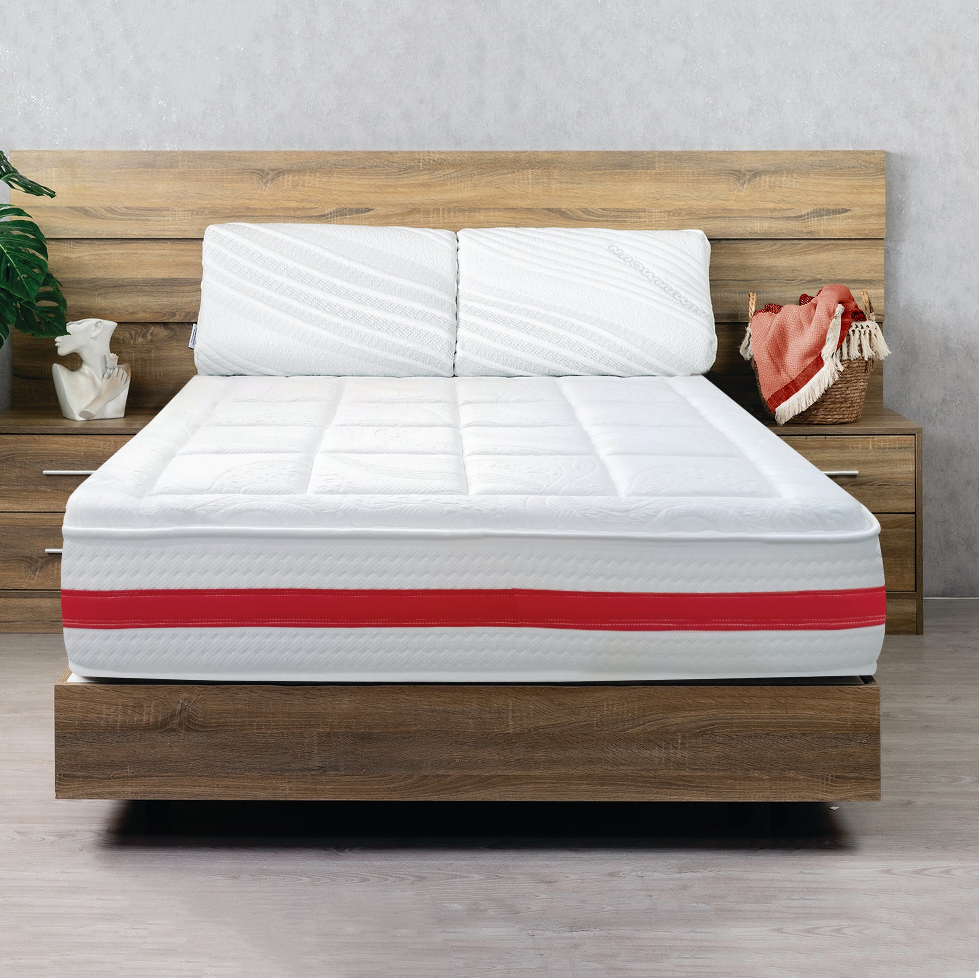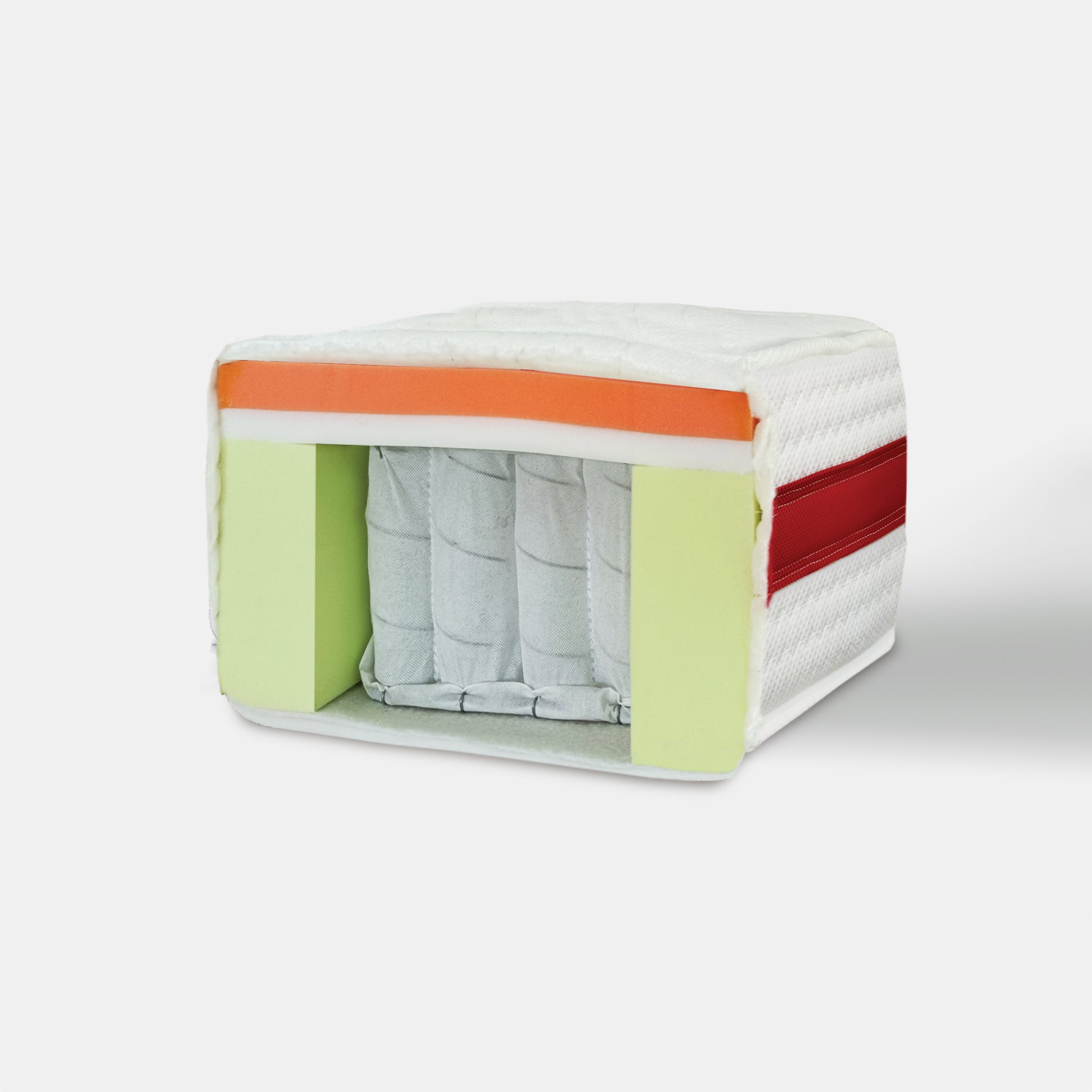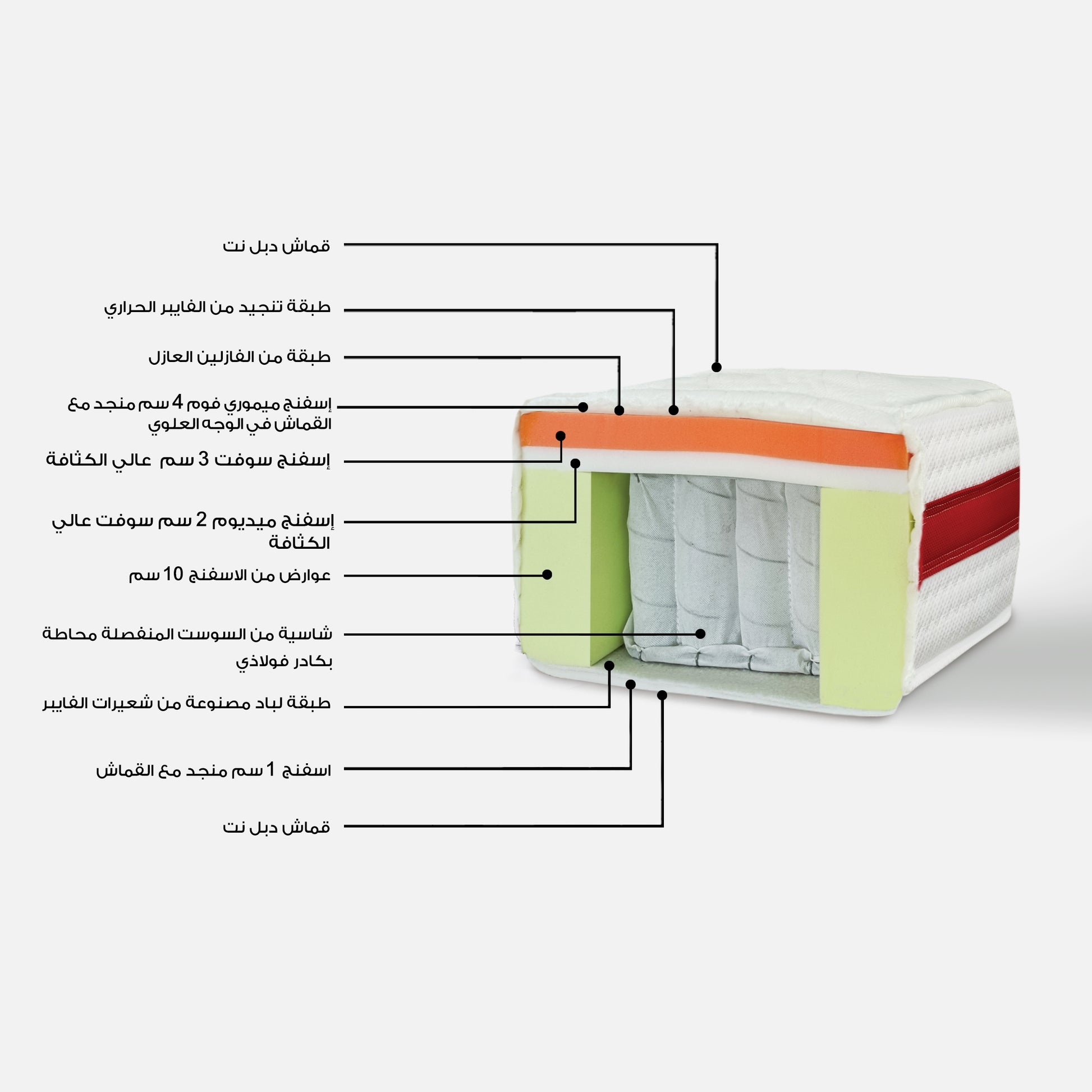 وتحتوي المرتبة على شاسيه من السوست المنفصلة المكون من 260 سوسته بالمتر المربع تقريباً من الحديد الفولاذي إرتفاع 18سم المعالج ومحاط بسلك 5 ملم من جميع الإتجاهات ليعطي تماسك وقوة للشاسيه ومغطى بطبقات من النسيج الغير منسوج واللباد العازل للرطوبة وطبقة من الإسفنج السوفت العالي الكثافة سمك 3 سم وطبقة من الإسفنج السوفت الميديوم العالي الكثافة سمك 2 سم والمرتبة مصنعة على أجود خطوط الإنتاج الآلي على الطريقة الألمانية بإضافة شرائح إسفنجية 10سم عالية الكثافة على محيط المرتبة ومثبتة مع طبقات المرتبة الأخرى بإستخدام مواد HOTMELT المستوردة لعمر أطول وراحة أكثر